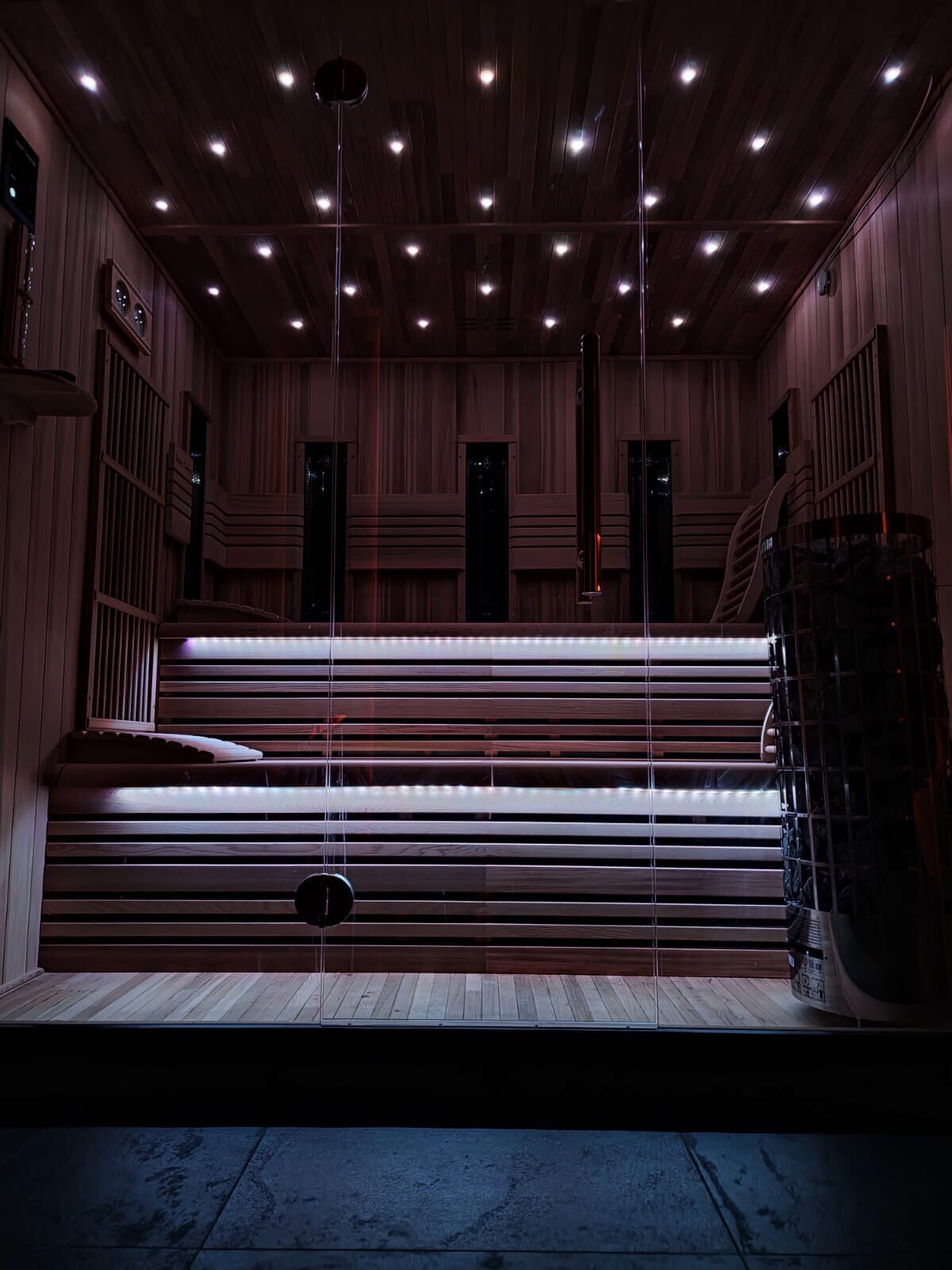 Finse sauna met infra-rood én zelf instelbare temperatuur.